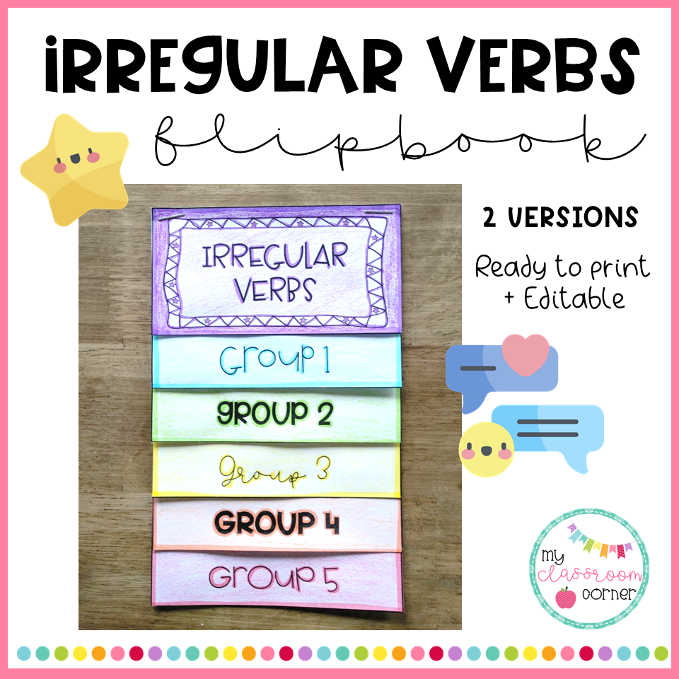 Con este Flipbook podrás trabajar los verbos irregulares agrupándolos en 5 categorías diferentes (en el vídeo de la portada se muestran brevemente cuáles son los verbos que se incluyen en cada una de ellas).